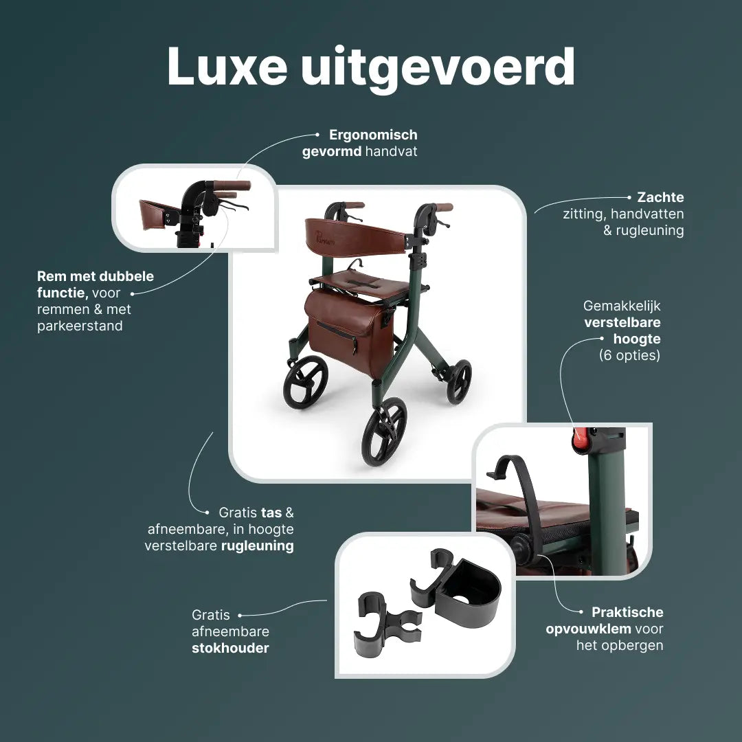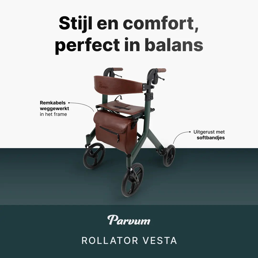 Alle rollators van Parvum worden standaard compleet geleverd. U geniet van accessoires zoals een stokhouder en een rugleuning. Daarnaast beschikken al onze rollators over een comfortabele zitting en in het geval van de Vesta over een stijlvolle boodschappentas. Deze rollator komt gebruiksklaar uit de doos.