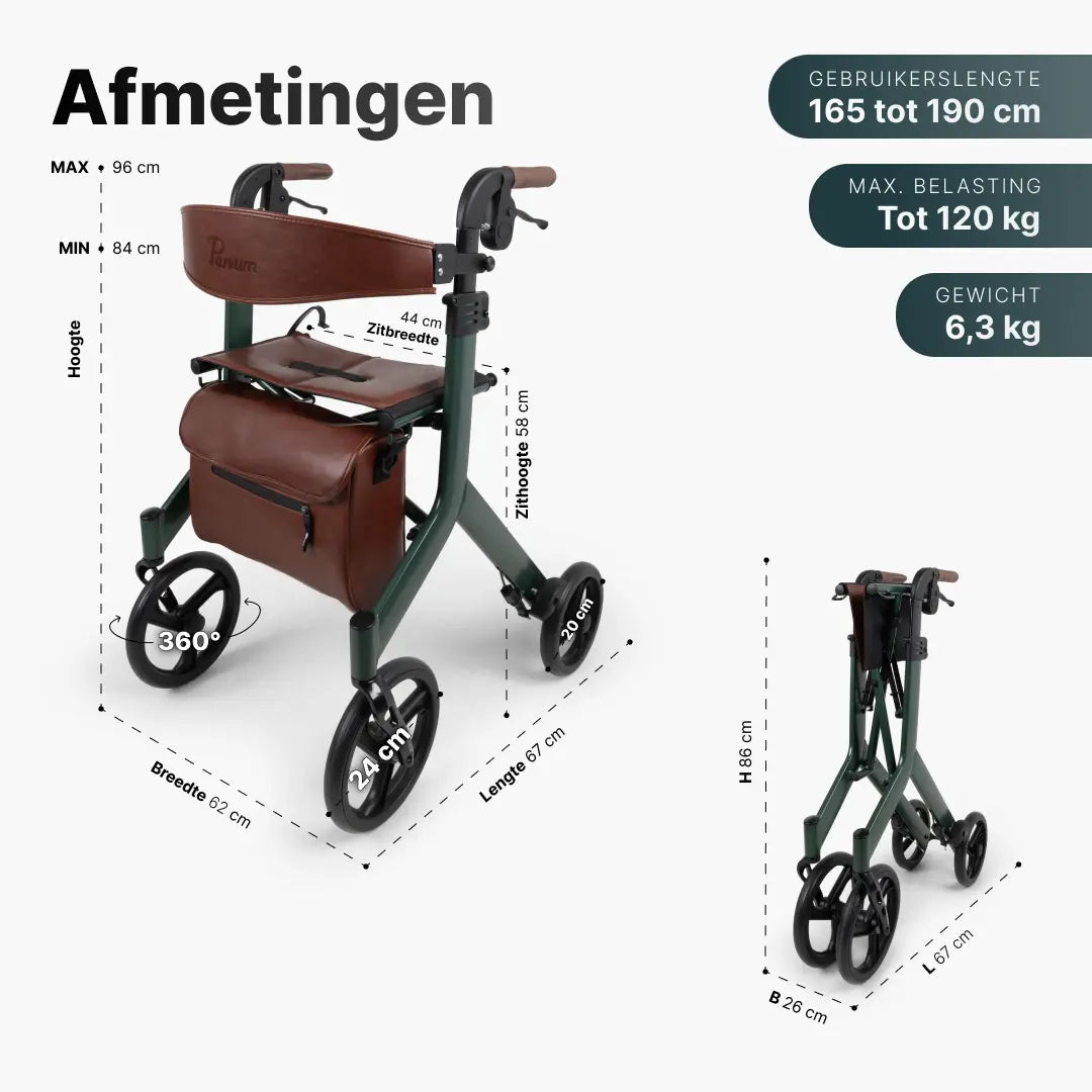 Wilt u het zeker weten? Meet dan de lengte van de grond tot aan het polshorloge van de gebruiker, terwijl de gebruiker rechtop staat met de armen langs het lichaam. Als deze lengte uitkomt tussen de 84 en 96 cm, dan is de rollator geschikt.